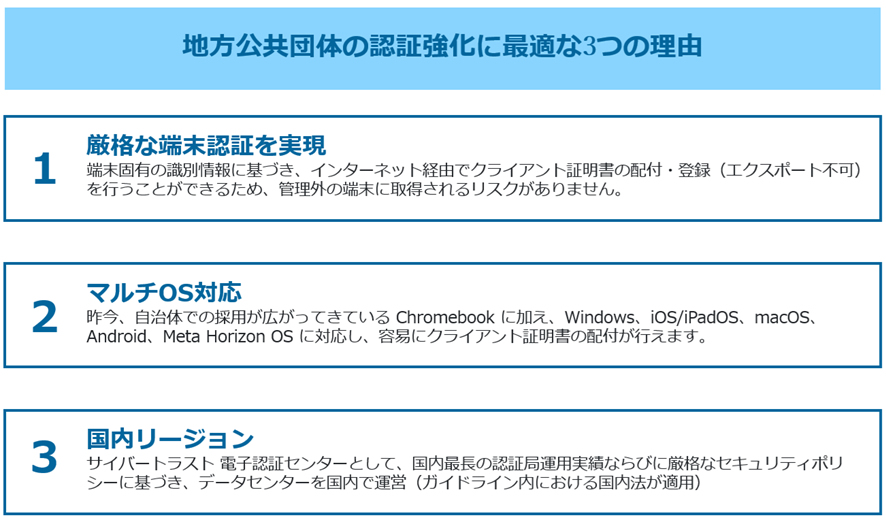 サイバートラストのクライアント証明書サービスである「 サイバートラスト デバイス ID」は、今回ご紹介した LGWAN 接続系 / マイナンバー利用事務系端末の無線 LAN 利用時におけるクライアント証明書を用いた認証や多要素認証としてご利用いただけます。