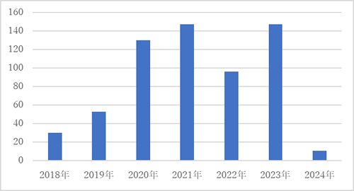 そのため、攻撃者は「情報資産の外部への漏洩」、「医療機関内の情報資産の復号化」の 2 つを盾にして身代金を要求するケースが増えてきており、イギリスの調査会社コンパリテック社が公開したアメリカにおける医療機関へのランサムウェア攻撃の件数においても、2019 年以降に被害件数が急増していることが見て取れます。