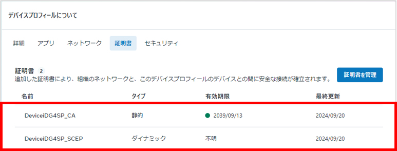 デバイスプロフィールを作成し、そのプロフィールに使用する証明書として「① ルート認証局証明書とクライアント証明書のアップロード」でアップロードしたルート認証局証明書とクライアント証明書を割り当てました。