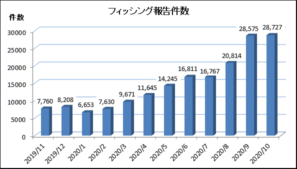 フィッシング対策協議会は、毎月同協議会に寄せられるフィッシング詐欺に関する報告を公表しています。2020 年 11 月に公表した、月次報告書「2020/10 フィッシング報告状況 」によると、報告件数は前月より 152 件増加し 28,727 件となっています。