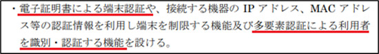 現行のガイドラインにおいても、不正アクセス対策として電子証明書を利用した端末認証や多要素認証 ※1 の必要性について明記されており、前述の JAXA へのサイバー攻撃についても、これらの不正アクセス対策が行なわれていたのであれば被害は限定的であったと考えられます。