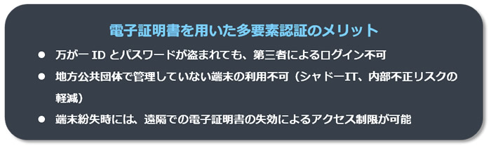 情報資産を取り扱うネットワーク機器の電子証明書を利用したアクセス制御または電子証明書の利用可能な IDaaS ※2 を導入することよって、地方公共団体で管理している端末のみに電子証明書をインストールすることで端末を限定したアクセス制御の環境を実現することができます。