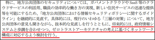 また、現在策定中のガイドラインでは、内部不正への対策が明記される見込みであることと合わせて、ガイドライン内ではデジタル庁が公開している「デジタル社会の実現に向けた重点計画」に記載されているゼロトラストセキュリティについて触れており、最新版のガイドラインにはゼロトラストセキュリティアーキテクチャの導入についてまでは含まれないものの、将来的な導入検討へ含みを持たせているのも特徴であると言えます。