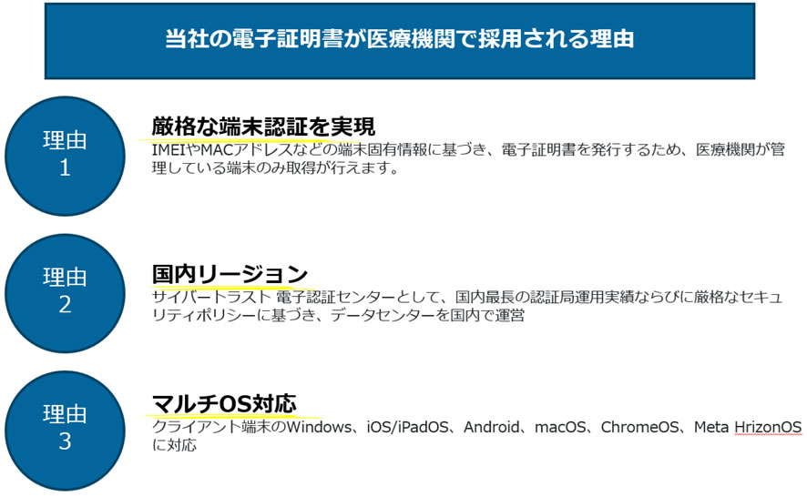 フィッシング耐性のある認証方式の一つとして、医療機関内で利用するパソコンやスマートフォンにインストールして認証時に利用するクライアント証明書が挙げられ、クライアント証明書を持たない端末からのアクセスを弾くことができます。