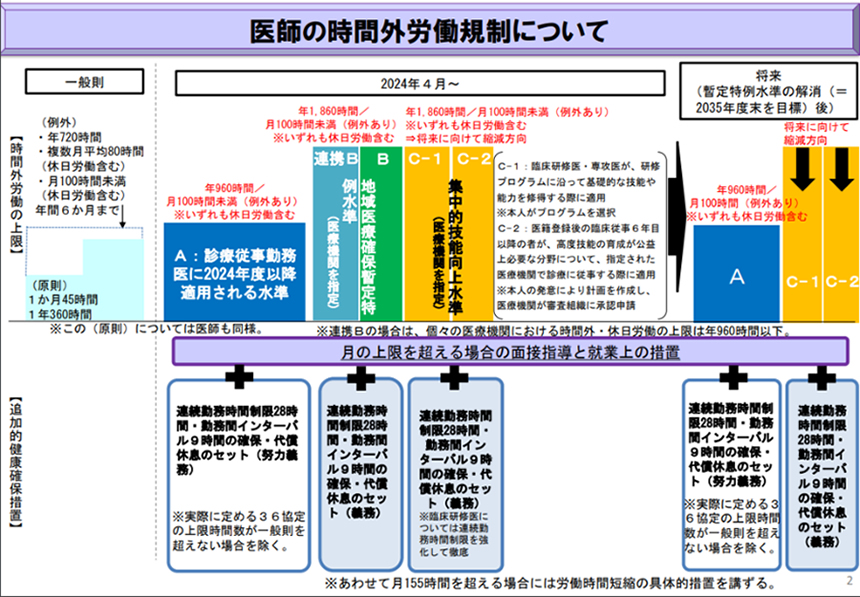 厚生労働省が推進する医師の働き方改革として、2024 年 4 月 1 日より診療に従事する勤務医には、時間外・休日労働時間の上限規制が適用されました。この規制では勤務医に対して、労働基準法に基づく規制として時間外労働を原則年間 960 時間まで(1 ヶ月平均 80 時間)、例外として一部の救急病院など、地域の医療体制を確保するために、長時間労働をせざるを得ない場合を想定して、「暫定で年間 1860 時間」の特例水準と罰則が設けられています。