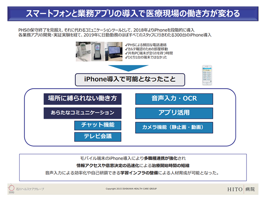 愛媛県四国中央市の HITO 病院では「場所や時間に縛られない情報共有の実現」のため、医師や看護師等の患者と接する職員に対し、PHS の代わりに iPhone を配付し、「チャットを利用した迅速な情報共有」、「iPhone の機能活用による事務作業の効率化」、「どこにいても患者さんの情報や電子カルテの入力 / 閲覧が可能となったことによる移動時間の削減」により、時間外労働が iPhone 導入前と比べて 54% 削減できたと公表しています。