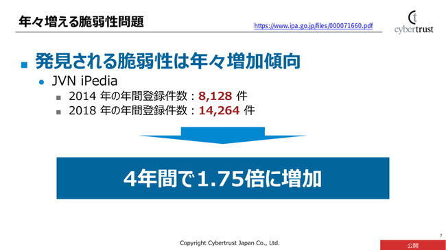 工藤氏は、脆弱性対策情報データベースJVN iPediaによると、発見される脆弱性は年々増加傾向にあり、4年間で2倍近くなっていることを指摘しました。