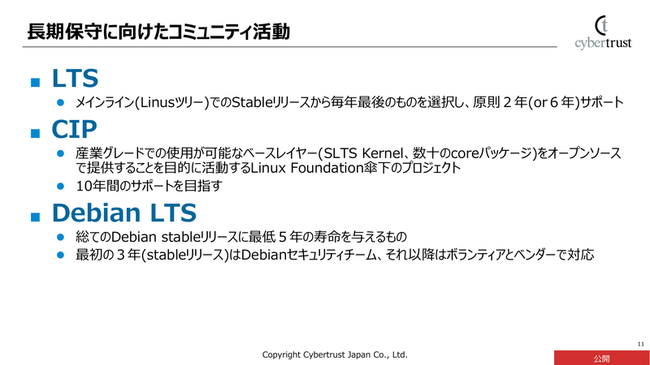 続いて工藤氏は、「共通課題に力をあわせて取り組む機運が高まっている」として、Linuxでの長期保守に向けたコミュニティ活動について解説しました。