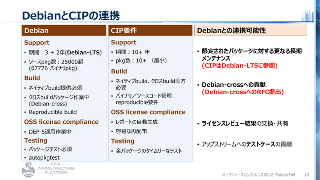 工藤氏は、CIPのSLTSカーネル+コアパッケージに、Debian LTSの追加パッケージを合わせる連携が協議されていると説明しました。CIPではカーネルのほかに、コアパッケージを含めたオープンソースベースレイヤ(OSBL)というセットを用意していますが、ここに含まれるのは数十の本当にコアなパッケージだけです。数万パッケージがあるDebianパッケージと合わせることにより、CIPのサポート範囲外のソフトウェアを使えるわけです。