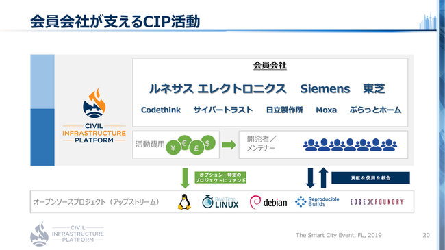 CIPには、ルネサス エレクトロニクスやシーメンス、東芝などの企業が参加しています。これらの活動基金をファンドしてプールし、CIPの開発活動にあてるほか、LinuxカーネルやDebianなど他プロジェクトへのファンドもしていると工藤氏は説明しました。