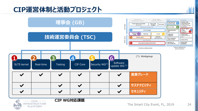 CIPの運営体制としては、この6つの活動が、技術運営委員会(TSC)の下で取り組まれていると工藤氏は説明しました。