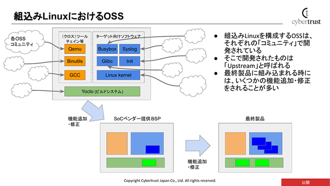 豊岡氏は、組込みLinuxの構成から話を始めました。組込みLinuxは、Linuxカーネルをはじめ、さまざまなOSSの組み合わせで作られています。それぞれのOSSはコミュニティで開発されており、そこで開発されるものをアップストリームと呼びます。