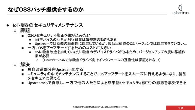 課題としては、まず、最新OSのセキュリティ修正を自社製品に取り込みたいということがあります。IoTデバイスのセキュリティ対策は法規制の動きもあるからです。ただし、アップストリームでは既知の脆弱性に対応していても、自社製品出荷時のOSバージョンでは対応できていなかったりします。とはいえ、OSに独自改造を加えていたり、独自のデバイスドライバがあったりして、自社製品のOSをアップデートするにはコストが大きいこともあります。