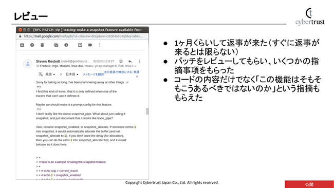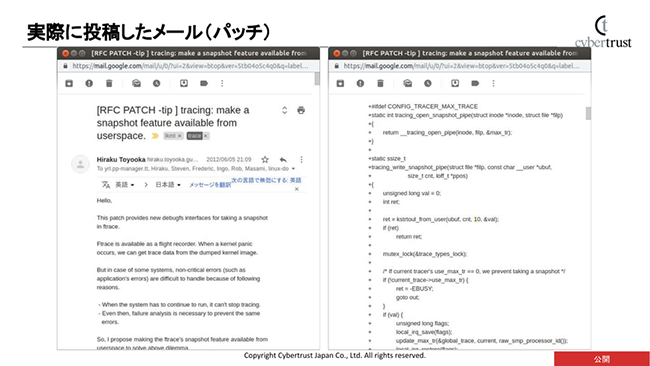 アップストリームにパッチを提供する方法について、実際に豊岡氏がLinuxカーネルにパッチを提供した例が語られました。