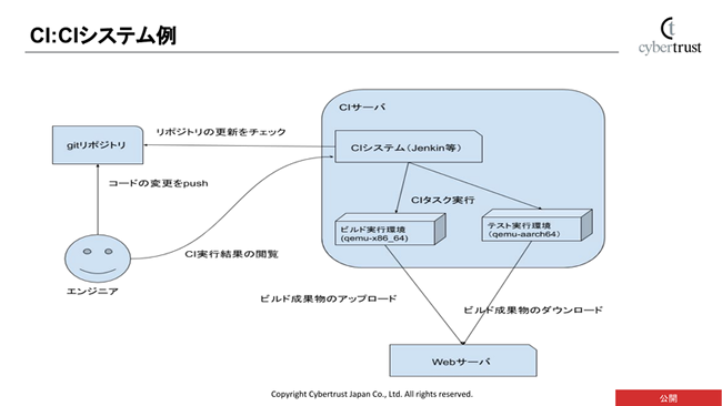 市川氏のセッションでは、組込みLinuxでのCI(Continuous Integration:継続的インテグレーション)の意義やツール、そしてLAVAを使ったCIの例について解説されました。