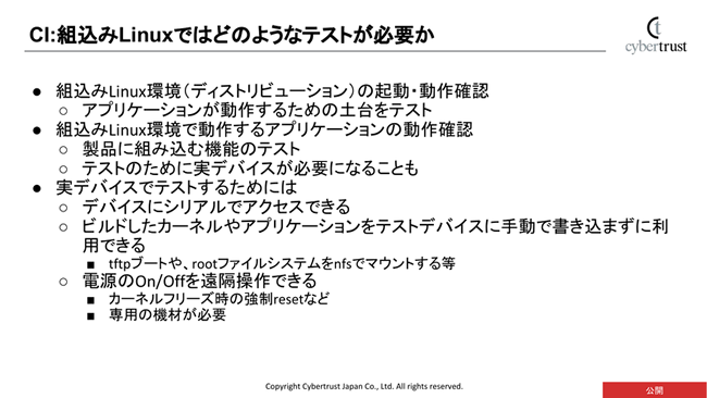 続いて、組込みLinuxでのテストについて市川氏は説明しました。