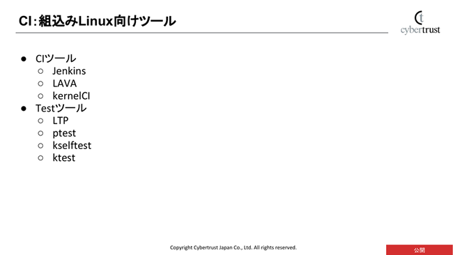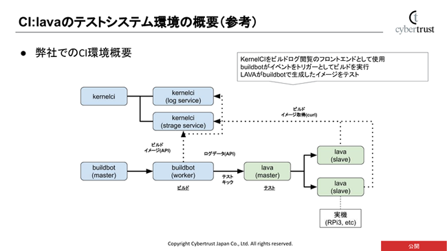 CIツールのKernelCIもあります。Linuxカーネルのテストにフォーカスしたもので、LAVAとJenkinsをバックエンドに利用しています。