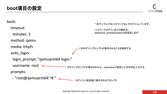 主な設定は、deploy、boot、testの3つ。deployでは、カーネルやrootfsをどうやってテスト環境に持っていくかを指定します。bootでは、ログイン時のアカウント情報などを指定します。testでは、実際のテストの内容を指定します。