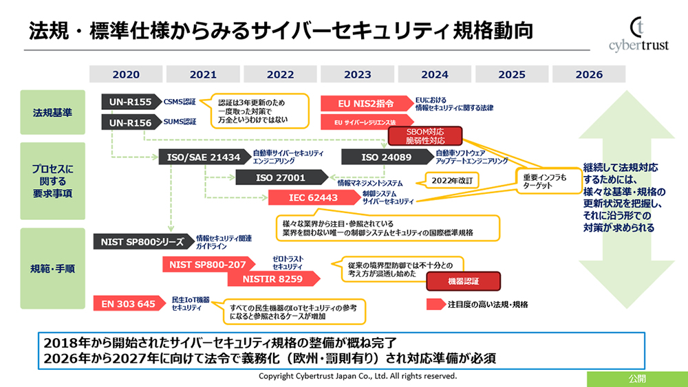 欧州、米国、イギリス、日本とも一見バラバラに策定しているように見えますが、実は規制内容は IEC62443 で共同作業をしており(米国では IEC ではなく ANSI と呼ばれる)、業界問わず IEC62443 がサイバーセキュリティの根幹をなしています。
