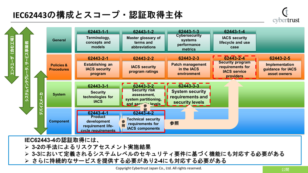 IEC62443 については、組織全体が適応する事が求められていることがご理解いただけると思います。これが適合認定までに 28 ヶ月~32 ヶ月を必要とする所以です。詳細は 続編 で解説します。