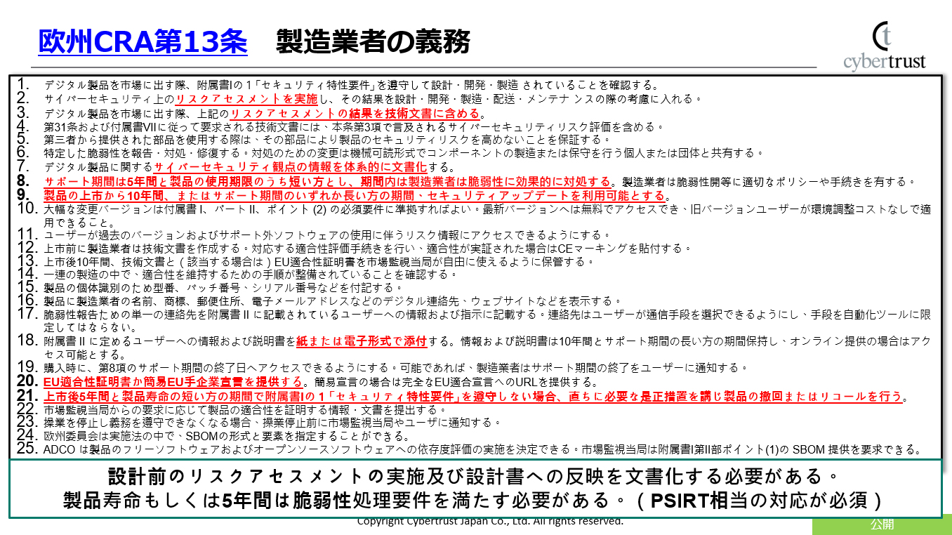 設計時からセキュリティを考慮していない製品は排除され、脆弱性についても製品寿命もしくは最大 5 年間は対応する事が義務化されます。セキュリティ事業者が古くから警鈴を鳴らしていたことが法規制化され義務化された形になります。