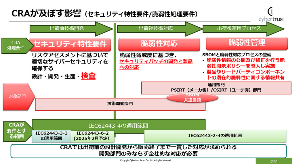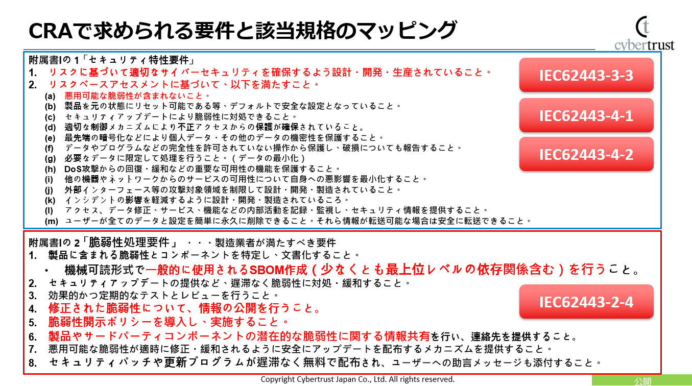 製品要件については、領域により対策が異なり、コンシューマー商材であれば ESTI EN303 645、産業・インフラ用機材であれば IEC62443-4-2 の内容把握が必須になります。