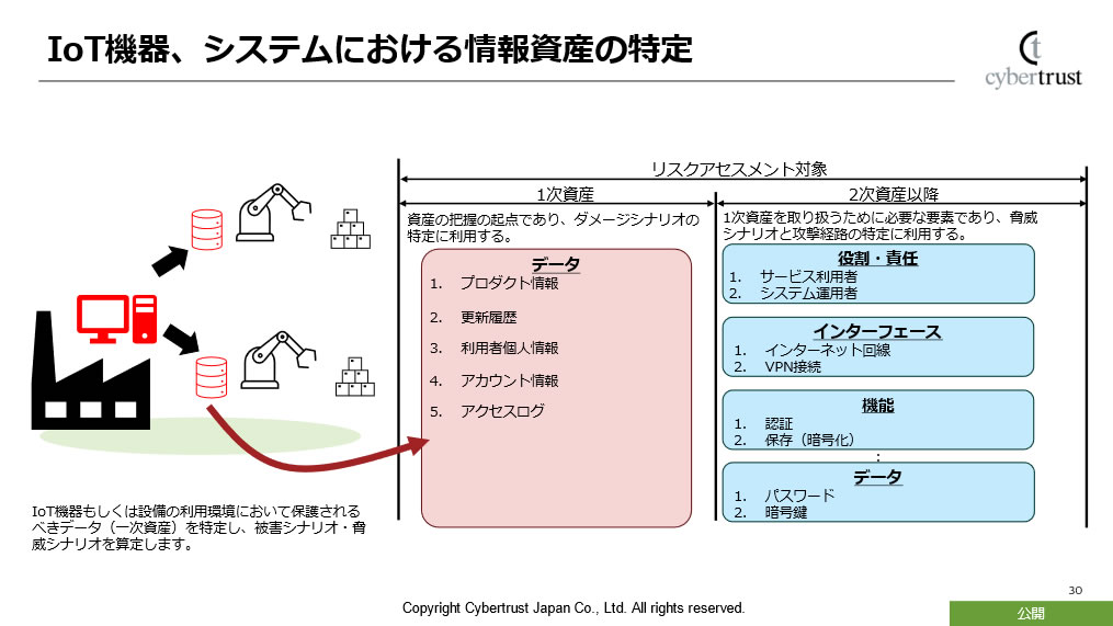 リスクアセスメントでは IoT 機器もしくは設備の利用環境において保護されるべきデータ(1 次資産)を特定し、被害シナリオ、脅威シナリオを算定することになります。ここでは機器のみならず利用される環境や 2 次資産を想定し、攻撃経路と脅威シナリオを策定します。この際システムに対しどのような権限を持つ人が存在するか、システムに対する通信経路とそれらに対する通信目的・内容を明確にし、最終的にはシステムが持つ情報資産を識別し、機密性(C)、完全性(I)、可用性(A)のいずれかに影響を及ぼすか判定を行うことが第一ステップです。