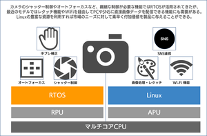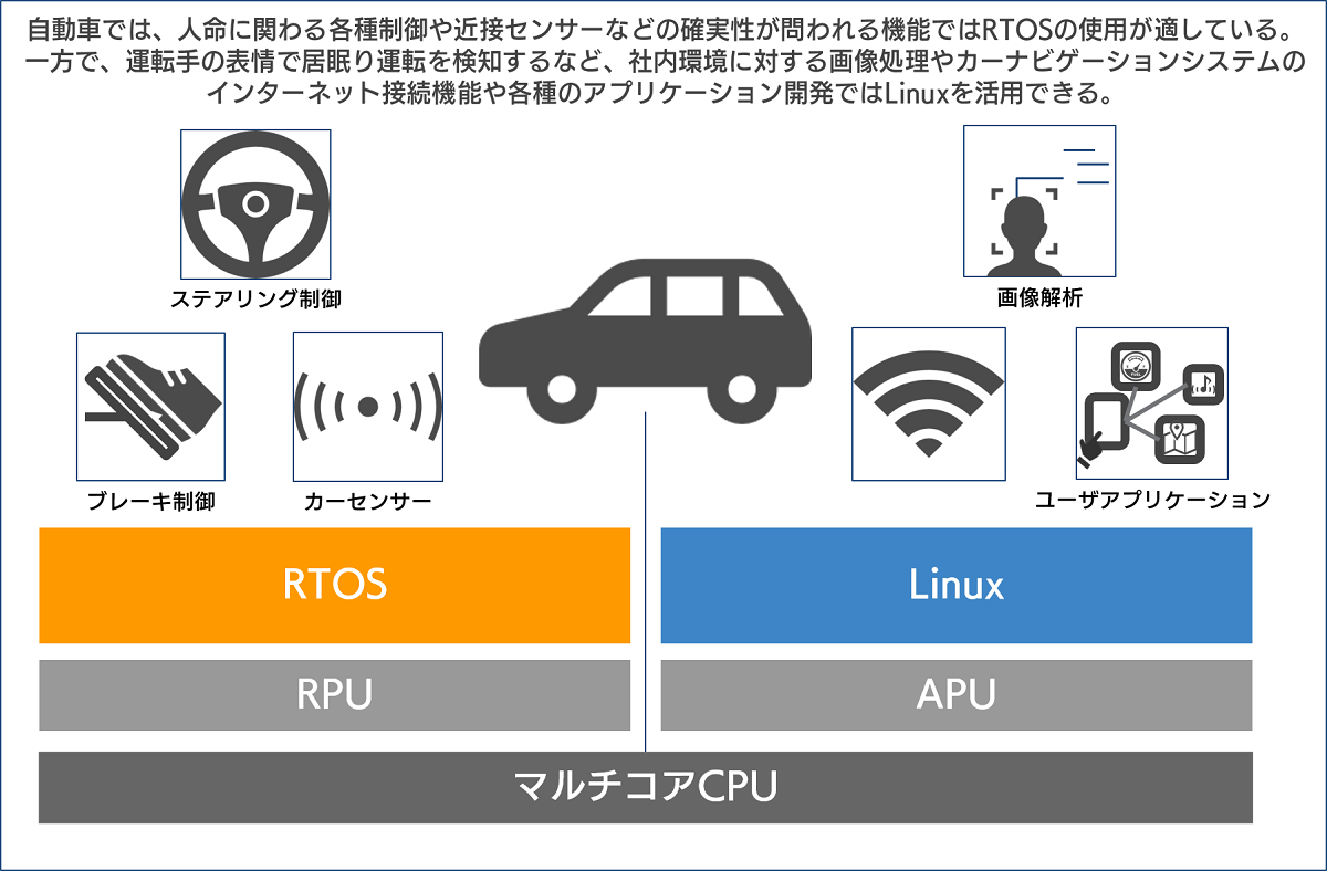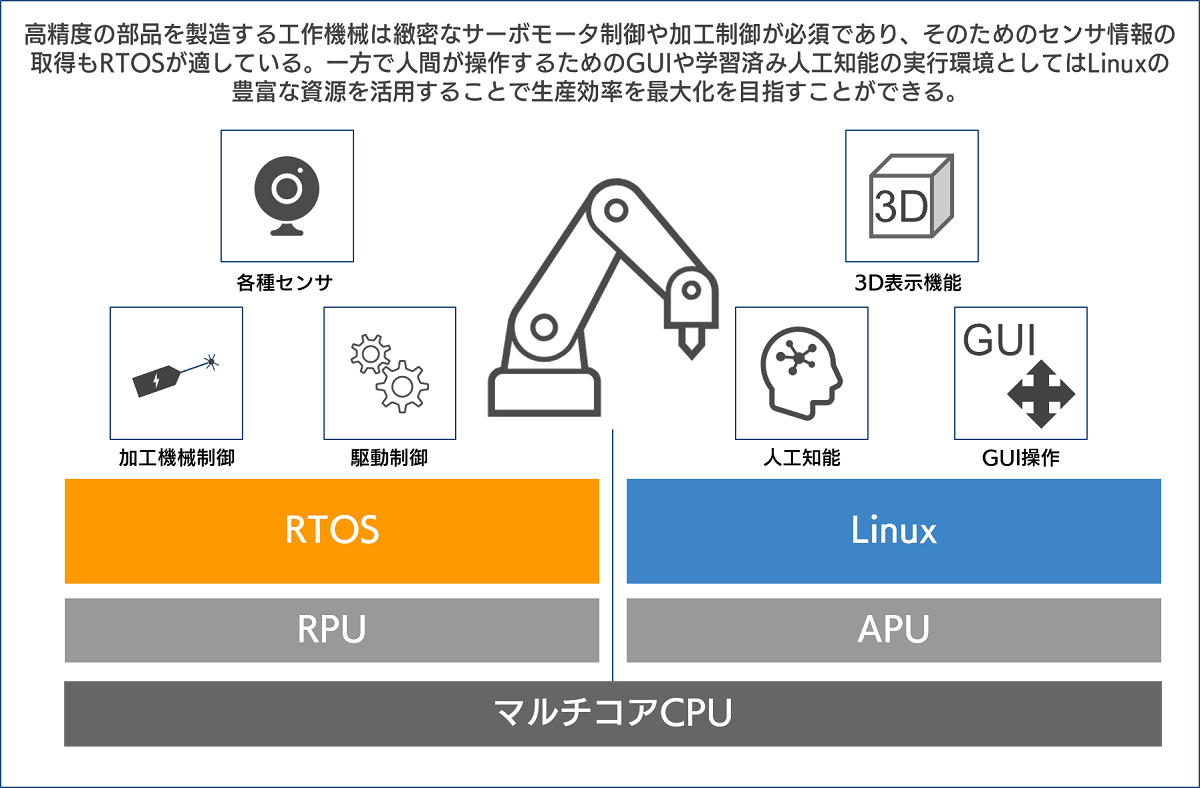 一方で、昨今の IoT・AI の流れから、RTOS (Real-time Operating System ; リアルタイムOS) を使用している組込みシステムにおいても RTOS では対応が難しいネットワーク機能や学習モデルの実行、音声やタッチインターフェイス等に対応した HMI などの様々な機能の実装が必要となり、RTOS の強みであるリアルタイム性などの資産を有効活用しつつ、汎用的で複雑な処理では Linux を利用するマルチ OS 構成の実装が強く求められています。