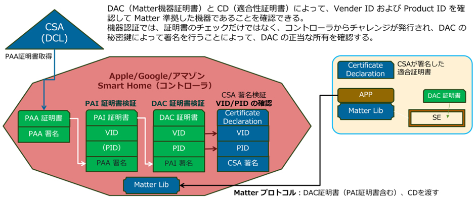 Matter 認証を受けたデバイスに関しては、DAC と呼ばれる Matter 機器証明書や CD(Certificate Declaration)と呼ばれる適合性証明書が埋め込まれます。