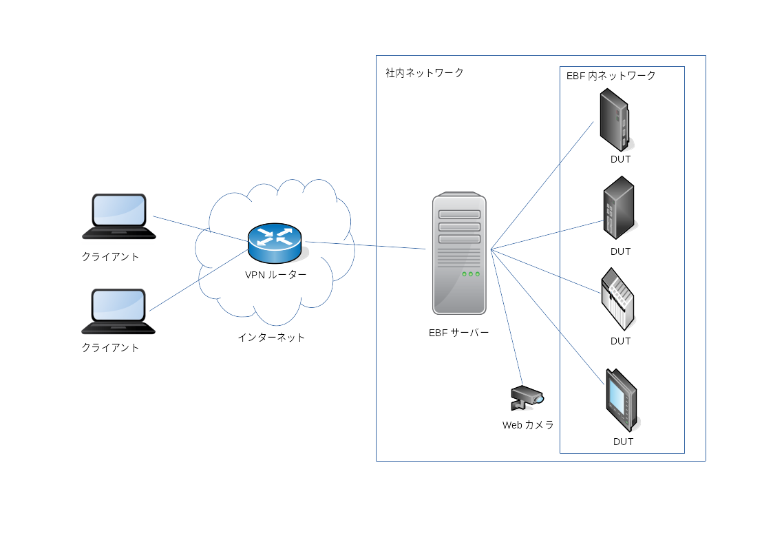 EBF サーバーは社内ネットワーク内にあり、リモートからのアクセスにはVPNを利用しています。