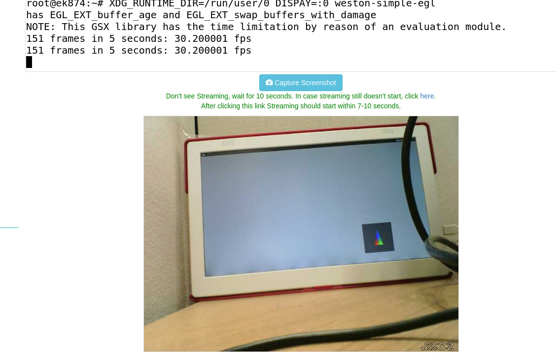 マウスやキーボードなどの外部入力は利用できませんが、Weston のテストプログラムを動かして描画に問題ないことを EBF に接続した Web カメラを利用して確認しています。