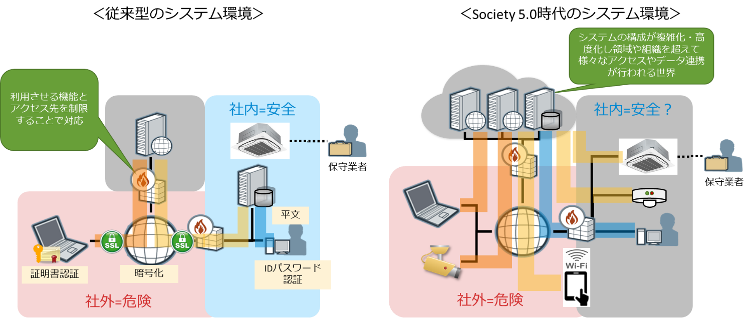 近年政府が推進する「Society 5.0」の世界においては、従来独立したネットワーク上で稼働していた、様々な機器が相互にデータ交換を行うようになります。そのような複雑なシステムでは、従来のセキュリティの考え方である「境界型セキュリティ(インターネットを境界としてファイアーウォールでアクセス制御する)」ではサイバー攻撃を防ぐことが難しくなり、今後は「Zero Trust Architecture(ネットワークに接続されるすべてのデバイスが個々にセキュリティ対策を行い、多層的に防御する)」が求められます。