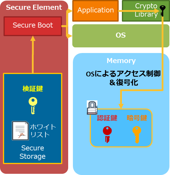 - セキュアブート:デバイス起動時に、OS、アプリケーションが改ざんされていないことを検証してから起動する仕組み
