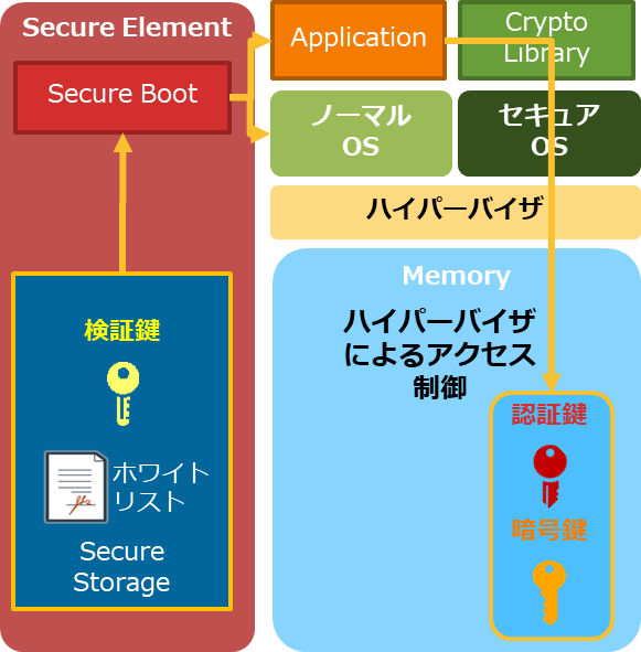 「ハイパーバイザにより保護」とは、OS およびメモリ領域の一部をハイパーバイザ等の機能によりアクセス制限し、そこに Trust Anchor を配置、保護する構成です。ハイパーバイザ、OS、アプリケーションの完全性を担保するためセキュアブートの実装、および、ハイパーバイザ制御外からの不正アクセス対策として、Trust Anchor の暗号化および暗号ライブラリの難読化も必須となります。