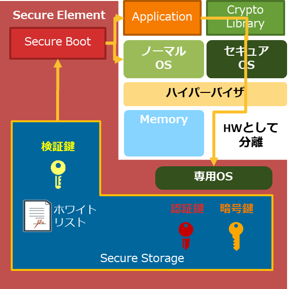 「ハードウェアとして分離」とは、ハードウェア的に独立したメモリ領域(セキュアエレメント内のストレージ)上に Trust Anchor を配置、保護する構成です。Trust Anchor は「セキュアエレメント」により保護されているため暗号化は必要ありませんが、Trust Anchor の不正利用から保護するため暗号ライブラリの難読化、および、ハイパーバイザ、OS、アプリケーションの完全性を担保するためセキュアブートの実装が推奨されます。
