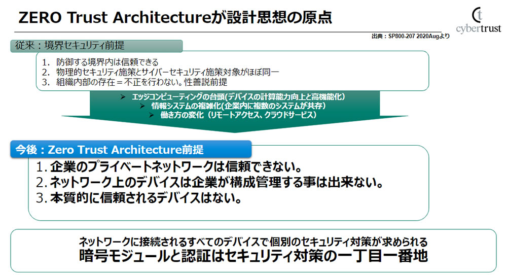 「ゼロトラスト」が 2020 年に入って急速に注目されてきている。その理由はいくつかあるがビジネスシーンでは(1)BYOD の普及、(2)クラウドサービスの普及、(3)テレワークの普及などがあげられる。従来であればオフィスなど物理的な場所とサイバーセキュリティを施す場所が同一であった。しかし、コロナ渦では場所を選ばないクラウドサービスの普及、1 人の人間が複数のデバイスを用い複数のサービス(リソース)にアクセスする事で生産効率性向上を行ってきており、これらの状況変化において従来の境界セキュリティでは対応が難しくなってきている。