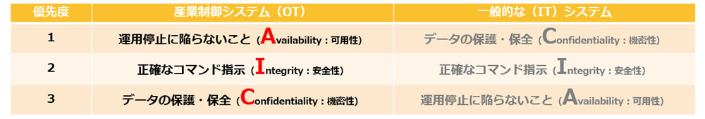 では、なぜ建物設備などの産業制御システムがサイバー攻撃に狙われるのか紐解いていく。設備導入要件に対する優先順位について、一般的な(IT)システムでは(C・I・A)であるのに対して、産業制御システム(OT)では(A・I・C)であり優先順位が真逆である。