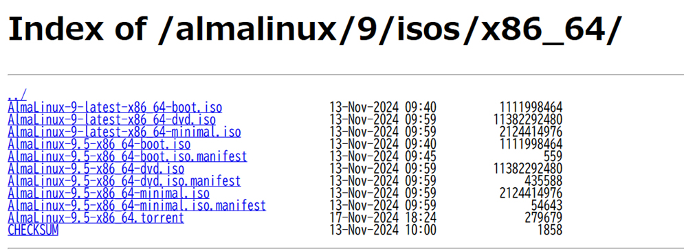 例えば、AlmaLinux 9 のダウンロードサイトでは、アーキテクチャ別に 3 種類のディレクトリが用意されています。