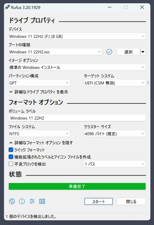 Rufus を利用すると、画面のように対象となる USB ドライブや ISO イメージを指定できます。