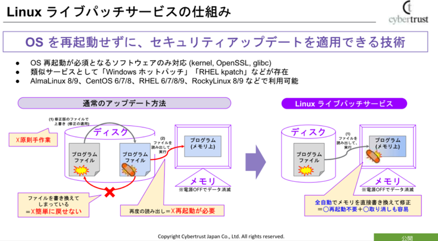 この技術により、脆弱性が発見された場合の迅速なセキュリティ修正と、システム稼働率の維持というトレードオフを解消できます。メモリ上のプログラムに直接パッチを当てる仕組みにより、OS 再起動を伴うアップデートコストを削減し、無停止でセキュアな運用を実現します。