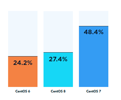 48% 超の CentOS 保有企業は間もなくメンテナンスが終了する CentOS 7 を利用しており、さらに 50% 超の CentOS 保有企業はすでに 2 年以上前にメンテナンスが終了している CentOS 6、CentOS 8 を保有しています。