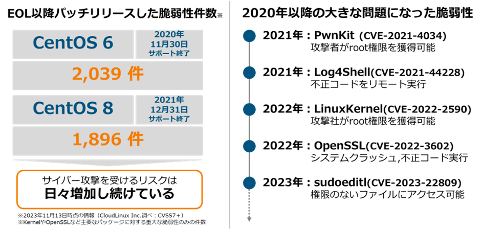 メンテナンスが終了している CentOS 8 、CentOS 6 ではすでに 2,000 を超える脆弱性が発見されており、サイバー攻撃を受けた際、無防備な状態です。また、CentOS 7 に関してもメンテナンス終了後は大量の脆弱性を内包することになり、非常に危険な状態となります。