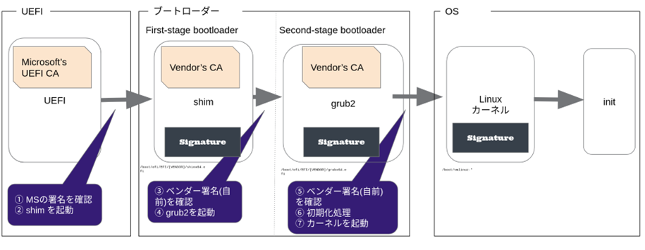 - もちろん例外はあり、GRUB を使わない構成も考えられます、その場合 shim は別のブートローダーを検証します。