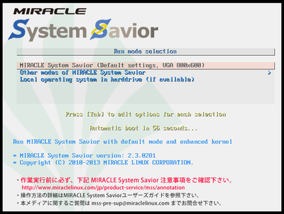 そう。起動すると、サーバが使っているディスクを認識できる仕掛けになっているの。例えば、サイバートラストの MIRACLE System Savior だと、こんな感じの起動画面が立ち上がってくるのよ。