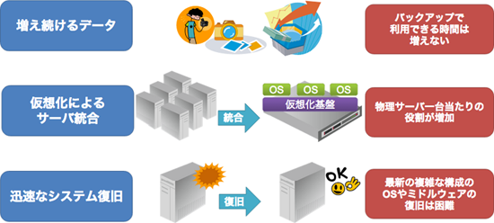 データの増大や仮想化によるサーバの統合など、サーバ環境は変化しています。また、システムの複雑化により最新の複雑な構成のシステムを復旧するのは困難になり、バックアップの再考が必要となっています。