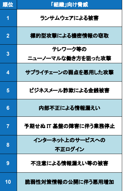 このようなサプライチェーン攻撃に対して、企業が取り組むべき必要性が高まっています。経済産業省の外郭団体である IPA(独立行政法人情報処理推進機構) が毎年発表している情報セキュリティ 10 大脅威において、今年、サプライチェーンの弱点を悪用した攻撃を 4 位にあげています。