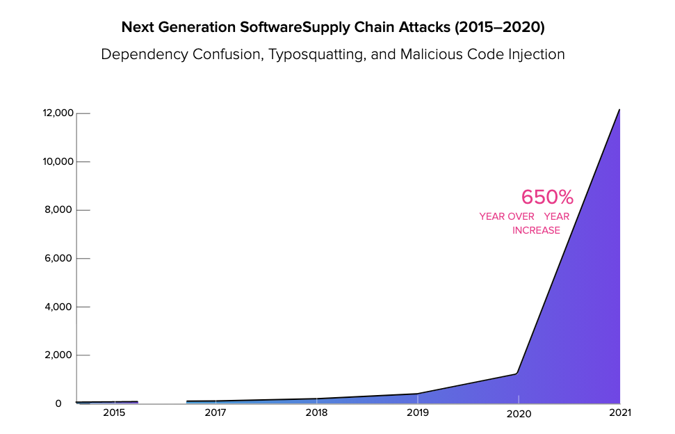 実際に、調査 (『2021 State of the Software Supply Chain Report』( 米 Sonatype 社 , https://www.sonatype.com/resources/state-of-the-software-supply-chain-2021 ) によれば、OSS のサプライチェーン攻撃が 650% 増加するなど、世界中で攻撃が急増しています。