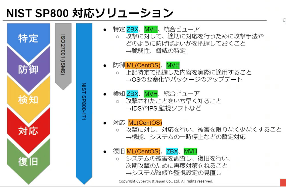 OSS の利用において、「特定・防御・検知・対応・復旧」までを網羅する唯一のソリューションは、「NIST SP800-171」の要件に準拠した Linux ディストリビューション MIRACLE LINUX および統合監視ツール MIRACLE ZBX に加えて、脆弱性の見える化を実現する脆弱性管理ソリューション MIRACLE Vul Hammer です。