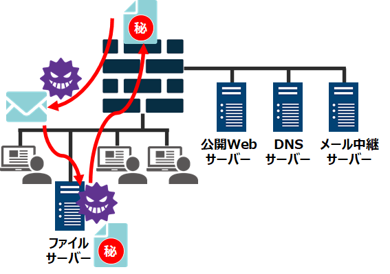 また、ファイアウォールで対策していても標的型攻撃により内部に侵入され、 内部の脆弱性をつかれて被害にあう事例 ( 以下図参照 ) や、自社システムはしっかり対策をしていても、サプライチェーンの弱いところを狙った攻撃も増えてきており、脆弱性管理は社会全体で取り組まなければならない課題となってきています。
