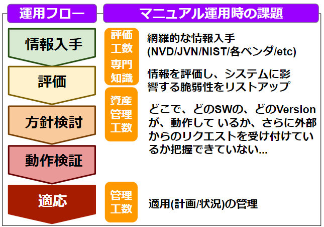 このように、日々の脆弱性管理が必要となってくる中で、どのように実施するかを考えていく必要があります。脆弱性管理をマニュアル作業で実施する場合、以下のようなフローを日々回す必要があり、そのためには多くの工数 / 専門知識が必要となります。特に、毎年 15,000 件を超える脆弱性が新たに出てくる中で、脆弱性情報収集や分析 / 評価をマンパワーに頼って行うことは現実的ではありません。また、人間系での作業のため、ミスも多く発生してしまうことが予測されます。